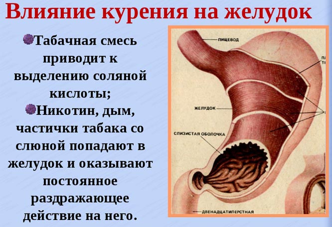 Когда больной курит, то при вдыхании дым попадает не только в лёгкие, но и доходит до желудка. В парах находятся вещества, которые проникают в желудок. Вредный дым дополнительно повреждает стенки слизистой, что приводит к появлению сухости во рту.